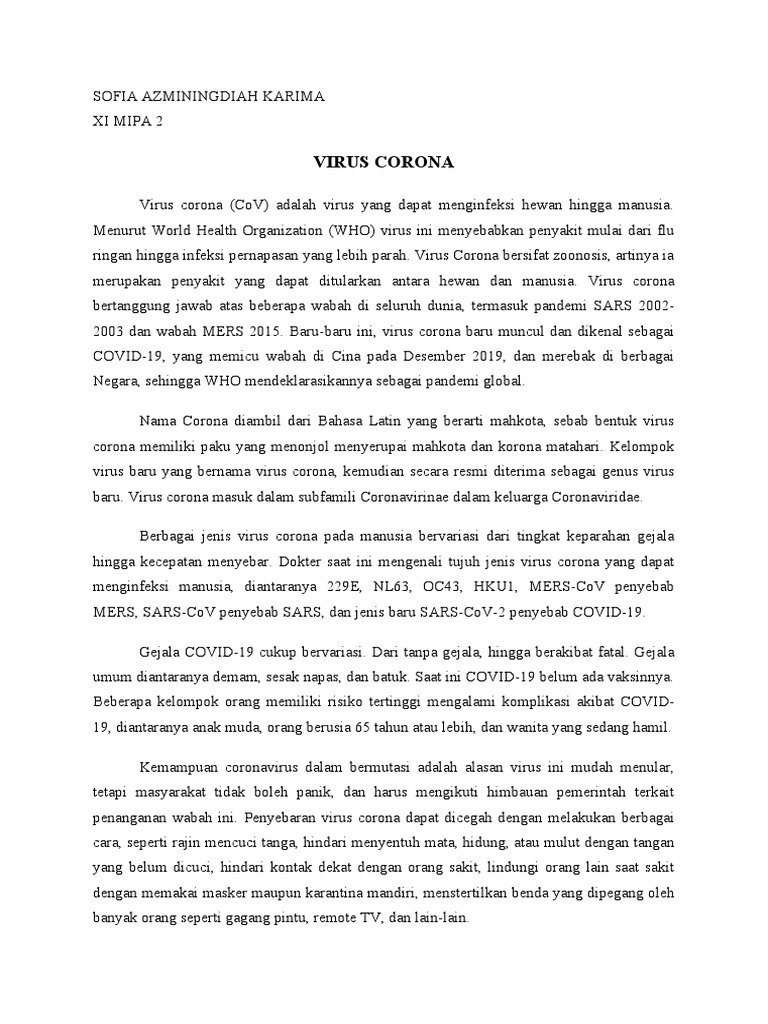 Teks Eksplanasi Virus Corona Sofia Azminingdiah Karima Xi Mipa 2